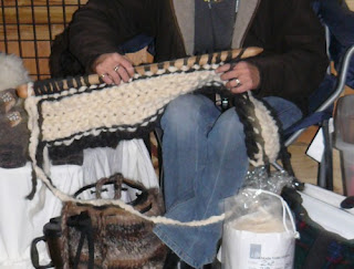 demonstrations, pattern books and much more. I saw light-up knitting needles (I guess so you can knit in the dark), and larger-that-life knitting needles like in the picture. It was nice walking around the show with Miss Cecile and Miss Carol because they could tell me what I was looking at. I bought some wooden knitting needles, gray yarn and some roving in hopes of learning how to spin. Oh, and we saw rabbits and alpacas. Below is a movie of the alpacas and the funny sounds they make.